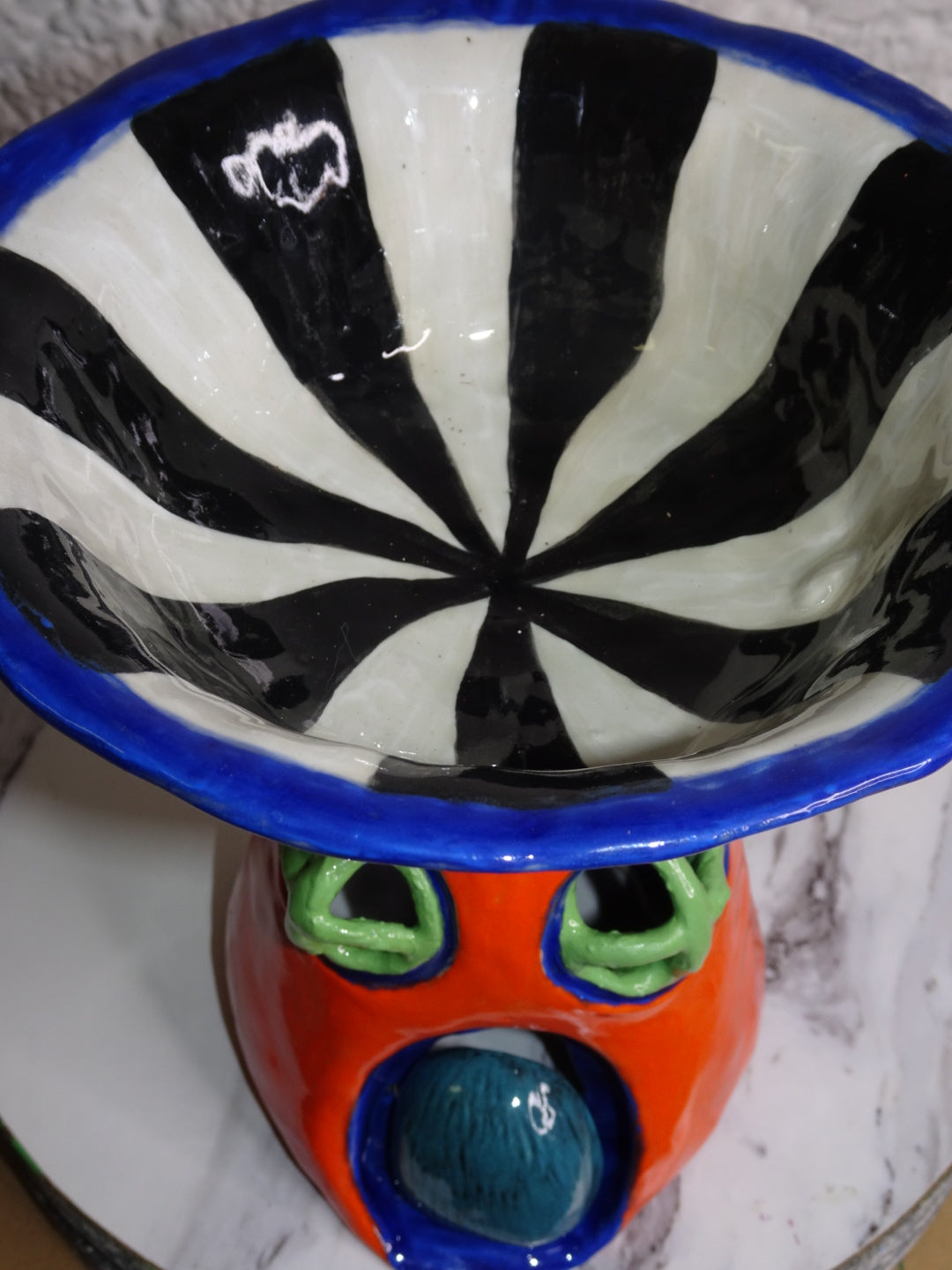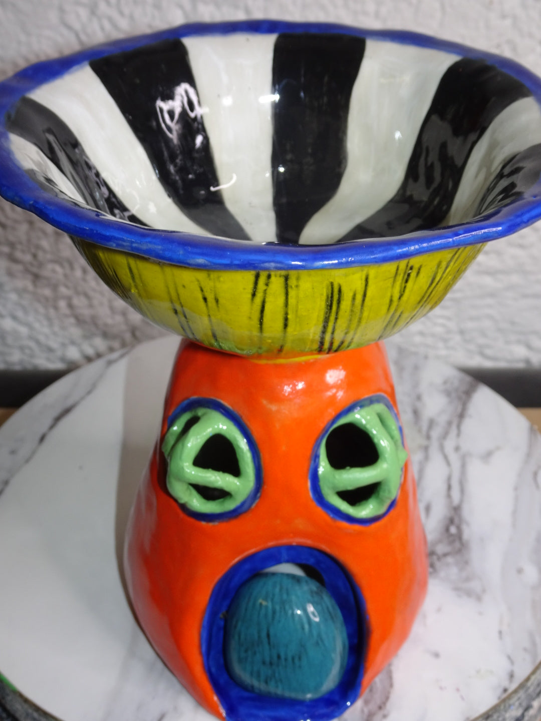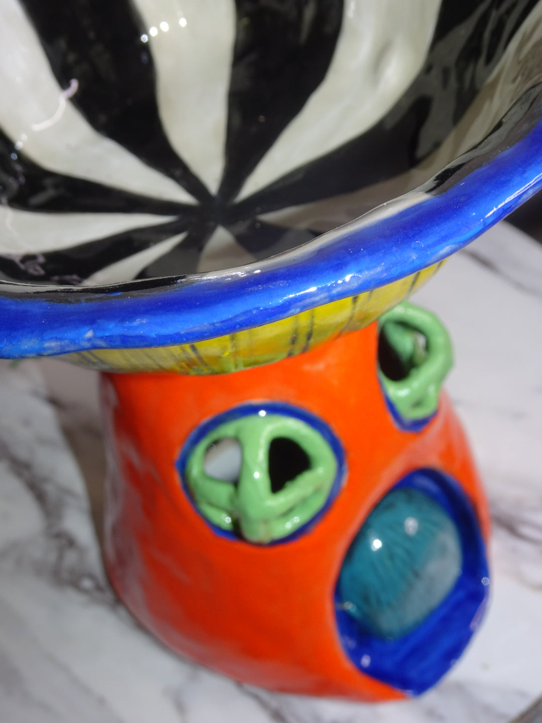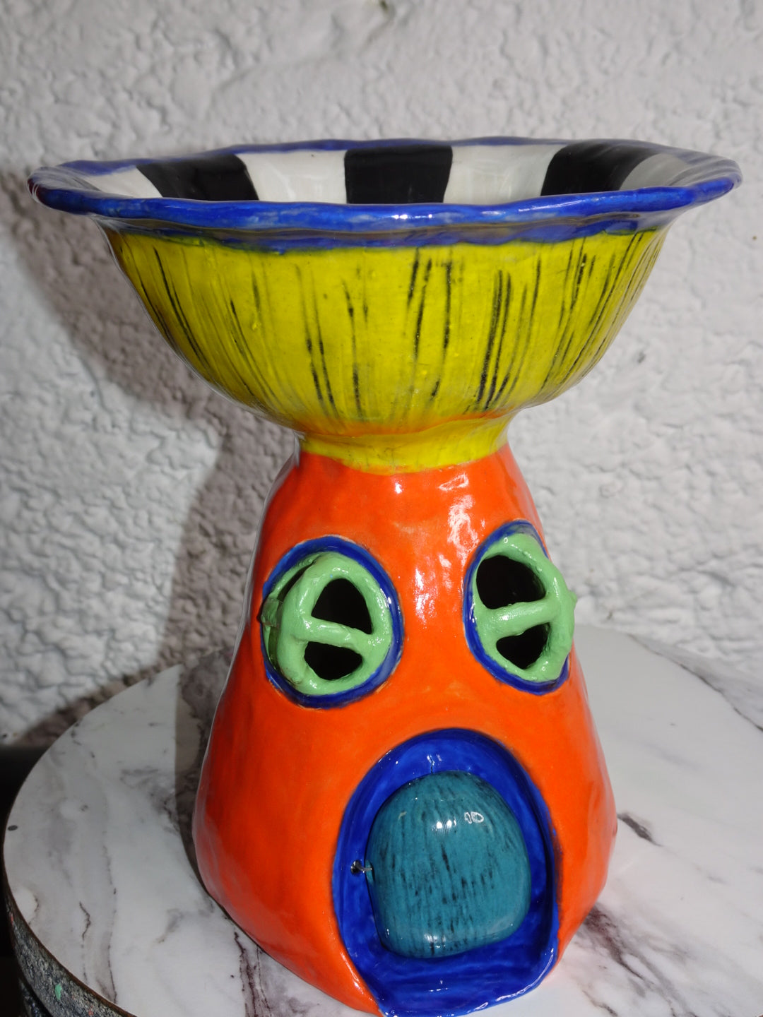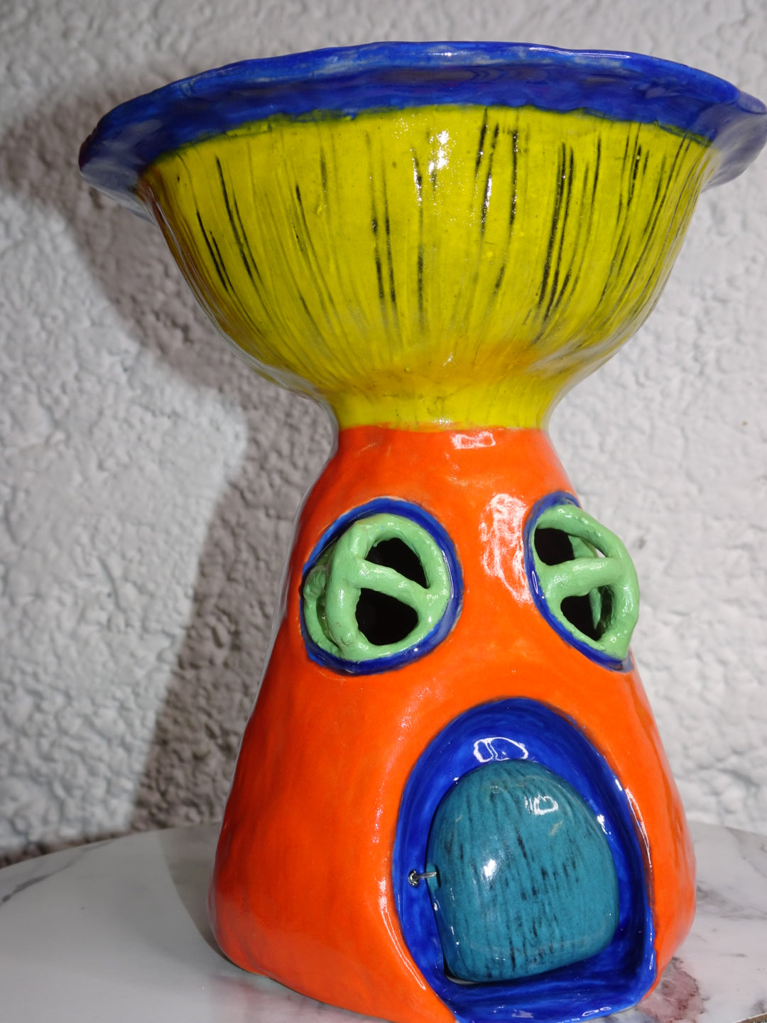 Hand built trippy mushroom house. Glazed in a psychedelic SpongeBob style, perfect art piece to display or could be used as a small serving bowl. Has a wired hinged door that swings open and closed.